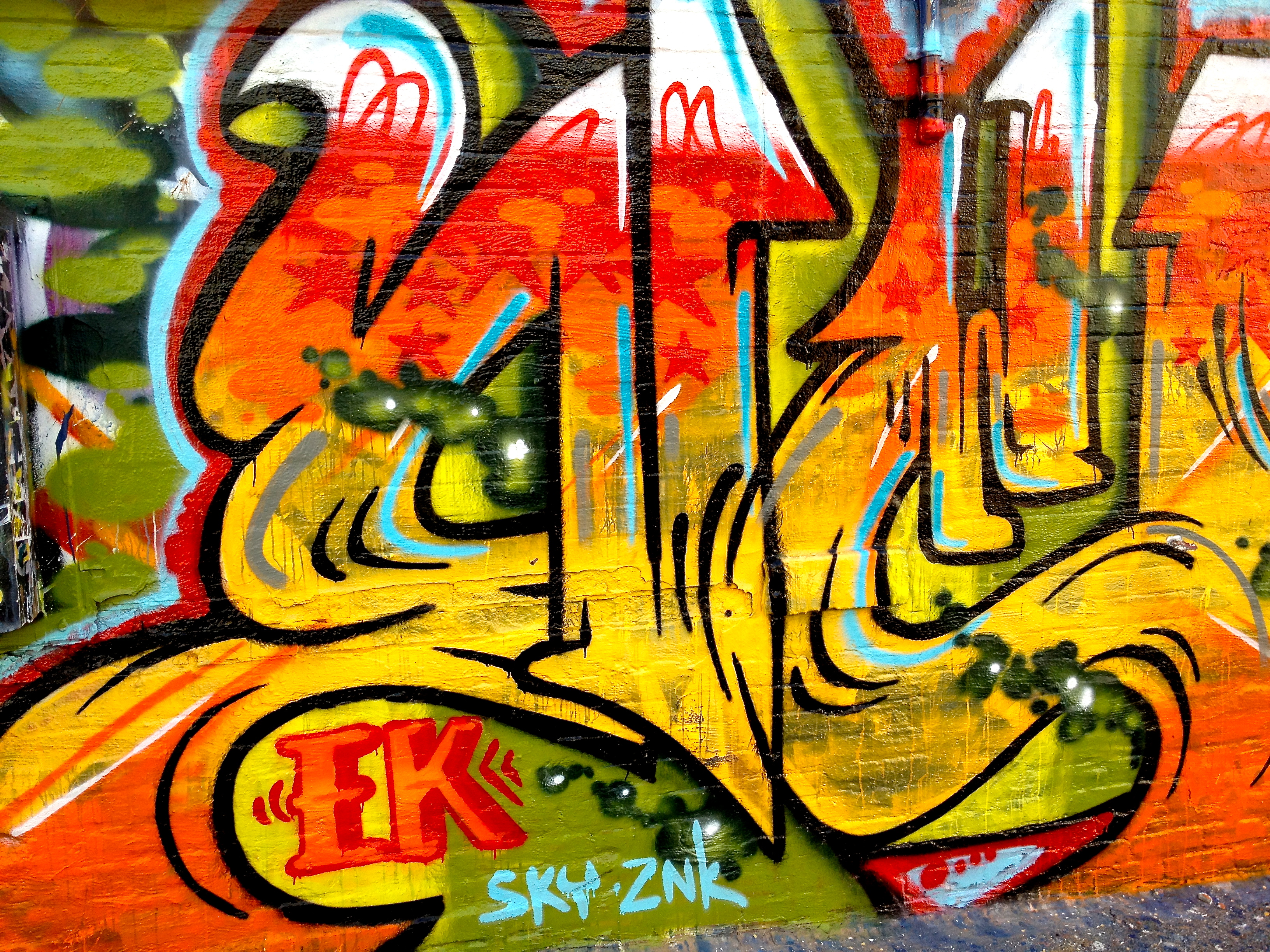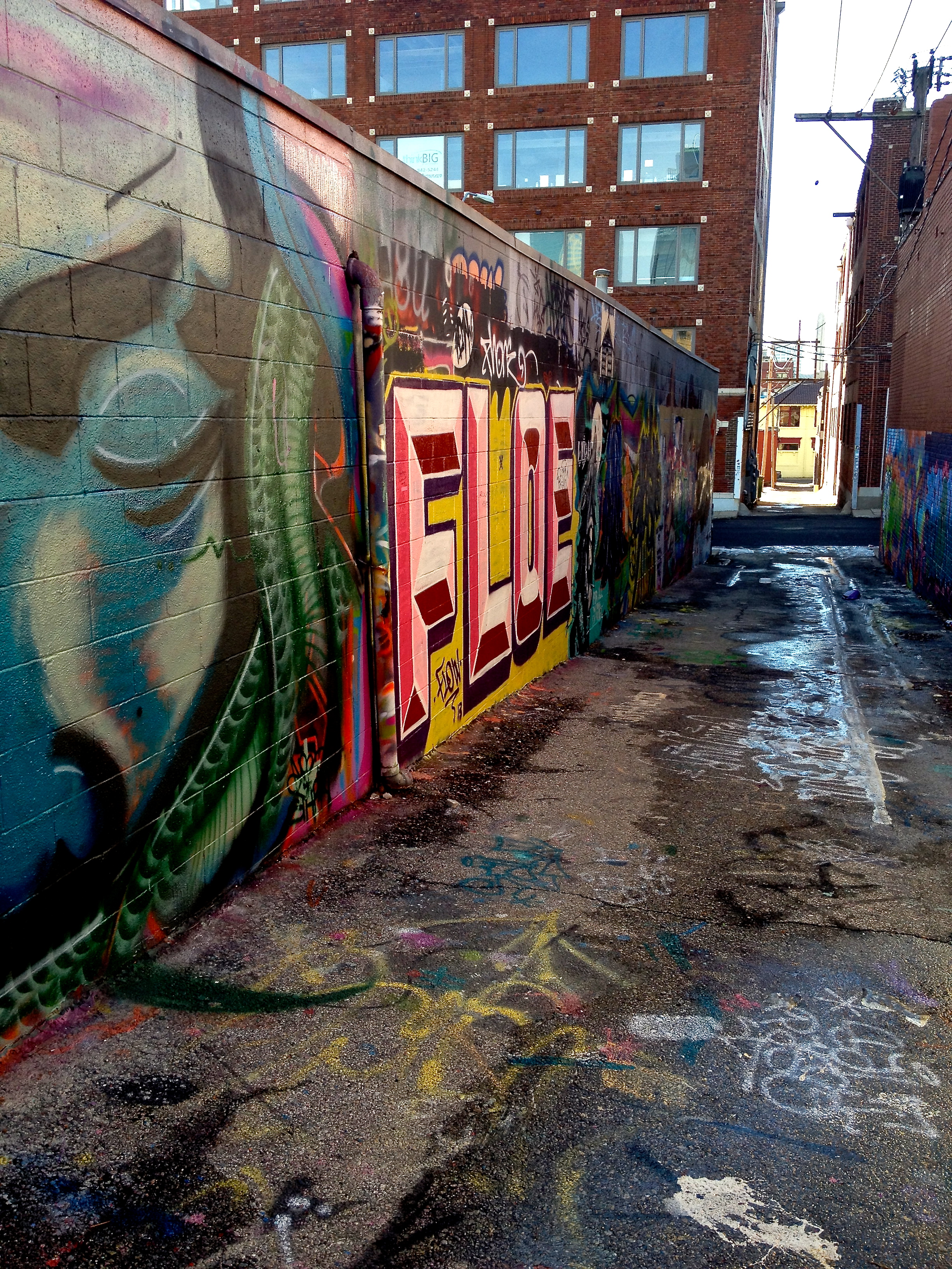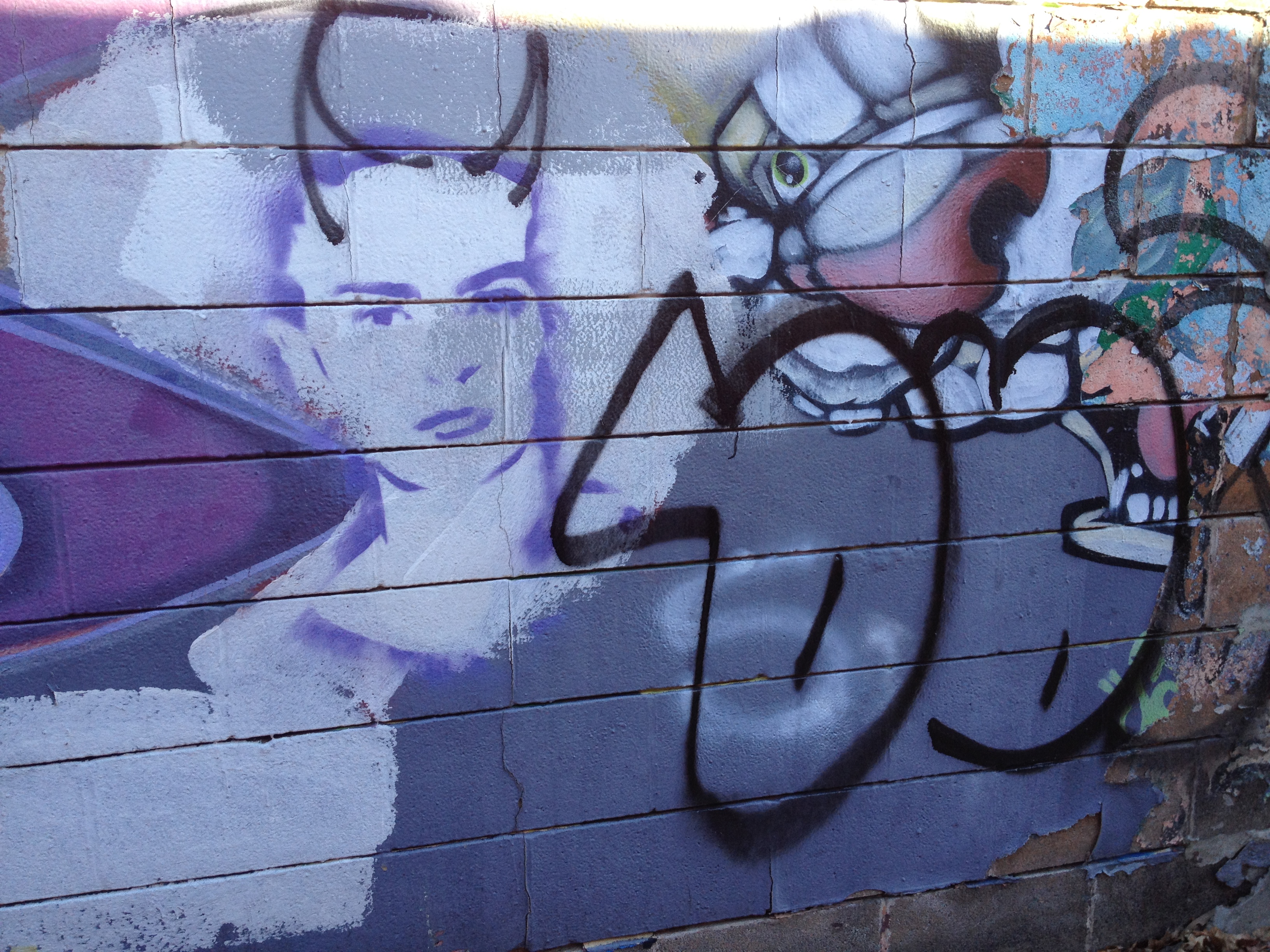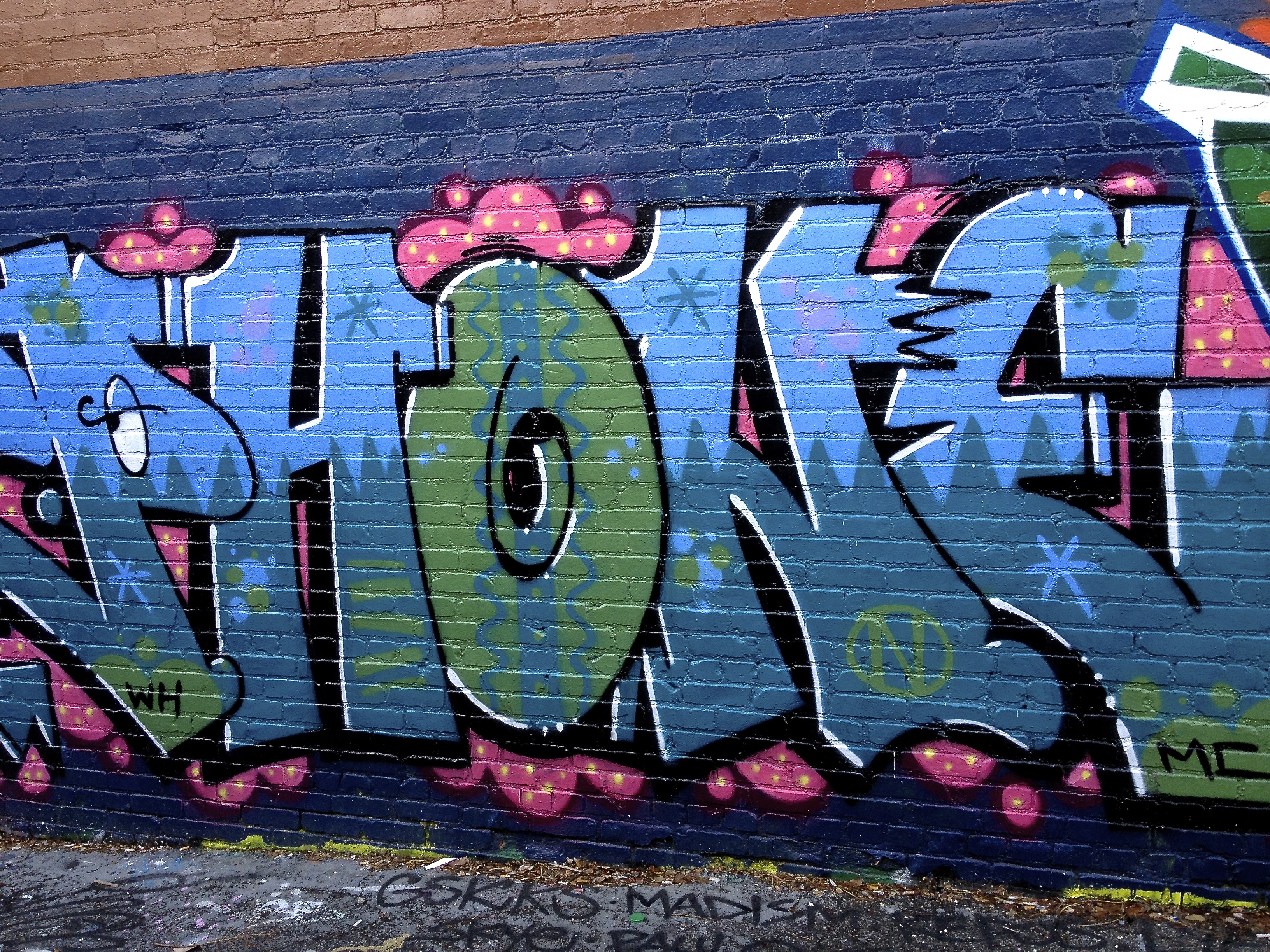 Much to my surprise, graffiti continues beyond the South edge of the parking lot through a stretch of alley that extends East to Central.