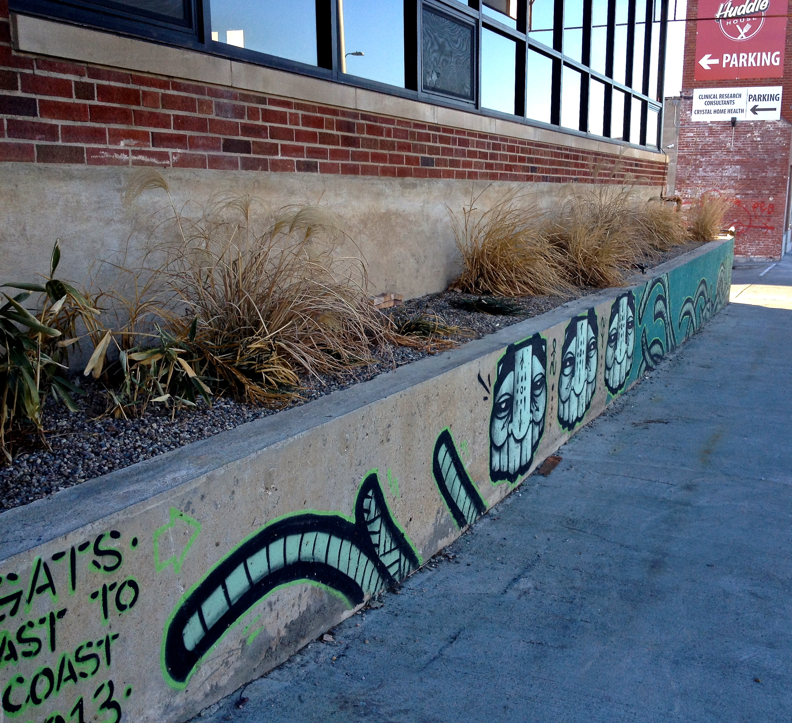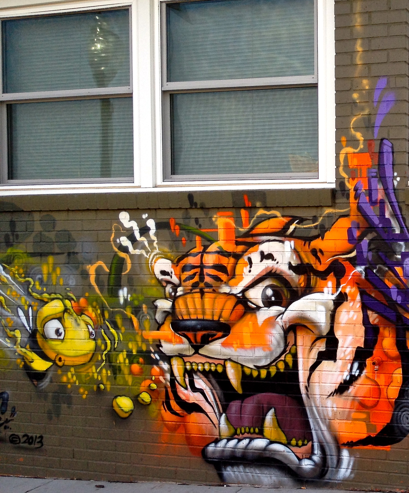 On the East side of Broadway, at 40th Street, there is a significant stretch of wonderful graffiti. Begin at the Open Fire Wood Burning Pizza shop. The front and South sides of the building have a wonderful mural identified as “GATS Coast to Coast 2013”. The reference to GATS sent me to the internet. GATS (Graffiti Against the System) identifies a California street artist whose paintings are found throughout the country as well as European countries including Portugal, Germany, Italy and England. While s/he claims to paint illegally, I cannot imagine many of these murals would be in existence without the approval of the property owners.