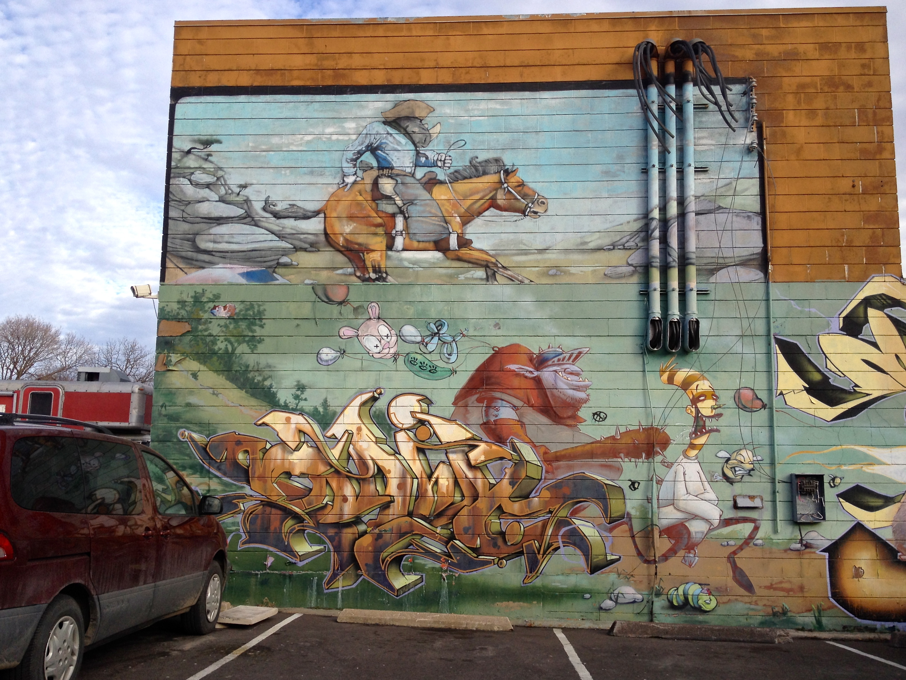 Follow the mural into the adjacent parking lot behind the Highway 420 Smoke Shop. There you will discover another series of panels created by different artists.