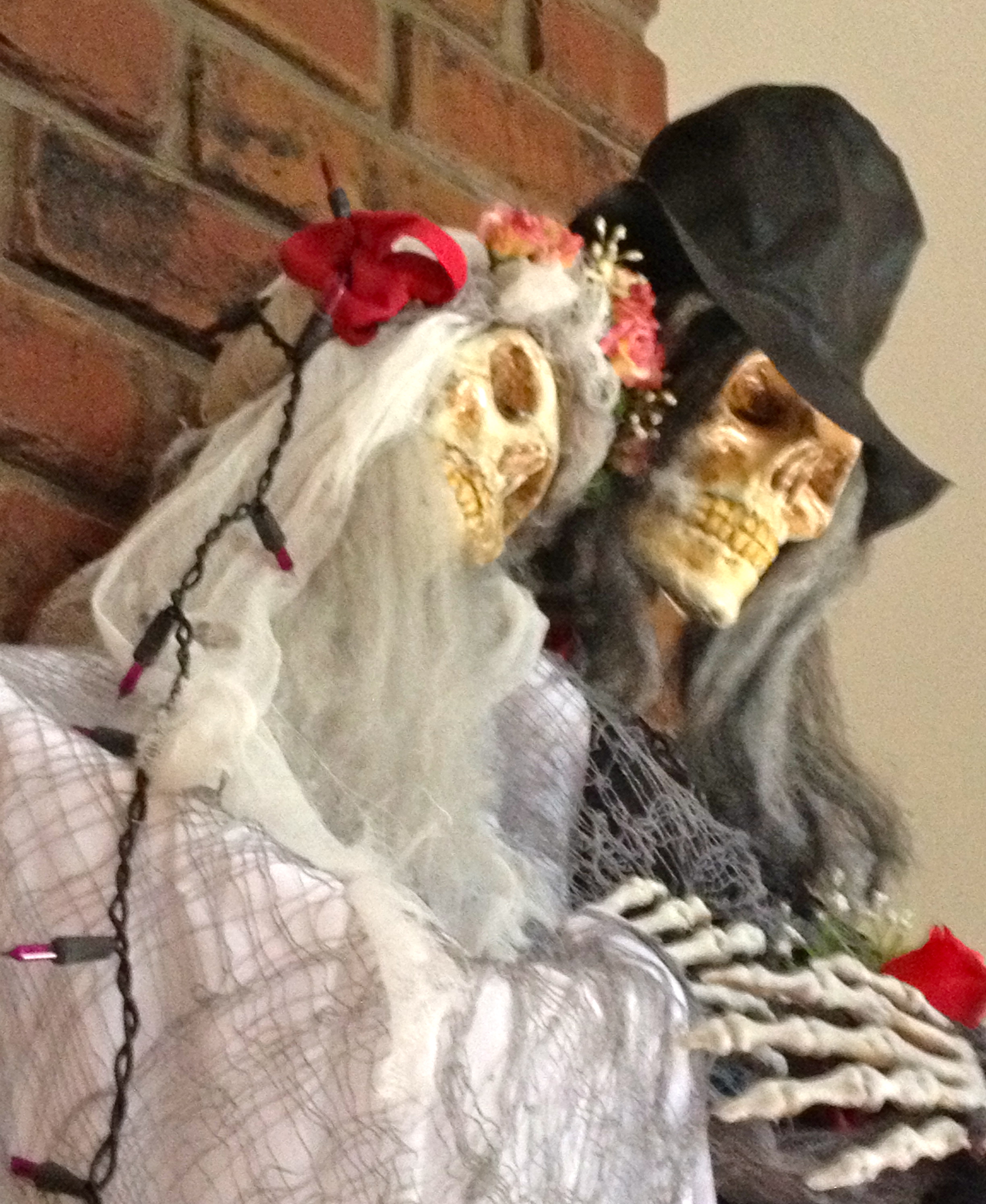 Skeletons in holiday attire, party outfits and wedding gowns are found in abundance.  The skeletons are fake–