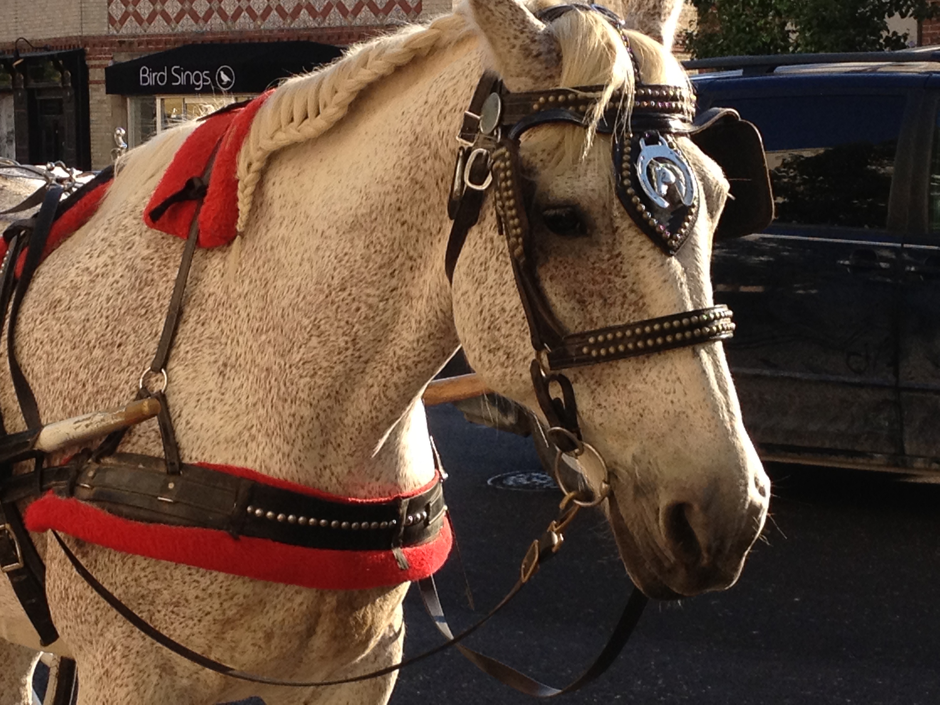 The horses may be somewhat past their prime, but they are docile and patient and decked out with braided manes.