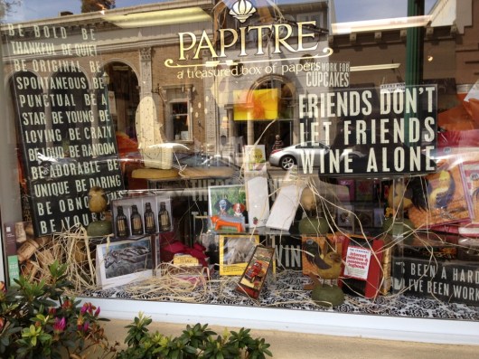 Healdsburg is another town with a small town feeling. In addition to the wine tasting room, the square is filled with restaurants, jewelry stores and gift shops. Wine is a constant theme. The reflection of the brick building across the street in this photograph of Papitre’s shop window suggested the tricks the mind can play as a result of “over-tasting”.