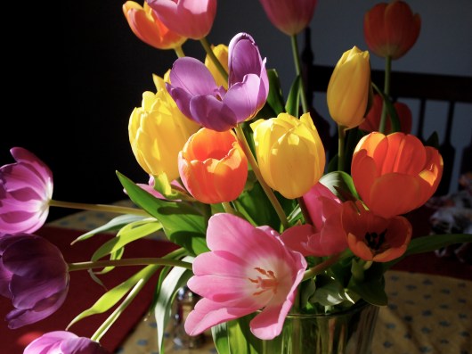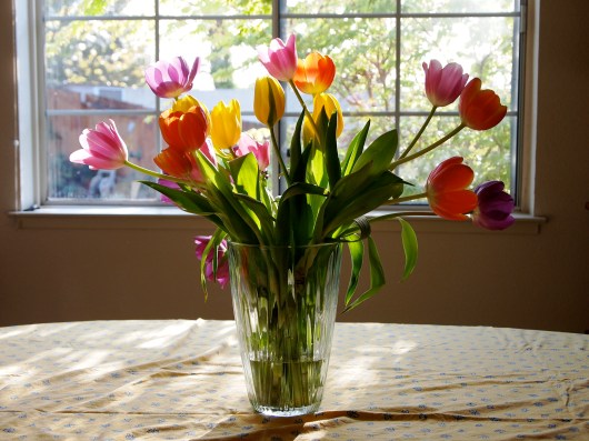 While my cute Mum was in town for Easter, she decided to brighten our Easter dinner table with these beautiful tulips. Now 3 days later, they are still lovely. As I was feeding the kids their morning eggs, I noticed the light coming in behind the vase. I am merely an amateur when it comes to photography, but I do love taking pictures. In this moment, I just couldn’t resist. I even moved chairs and placements for one of them. So lovely.