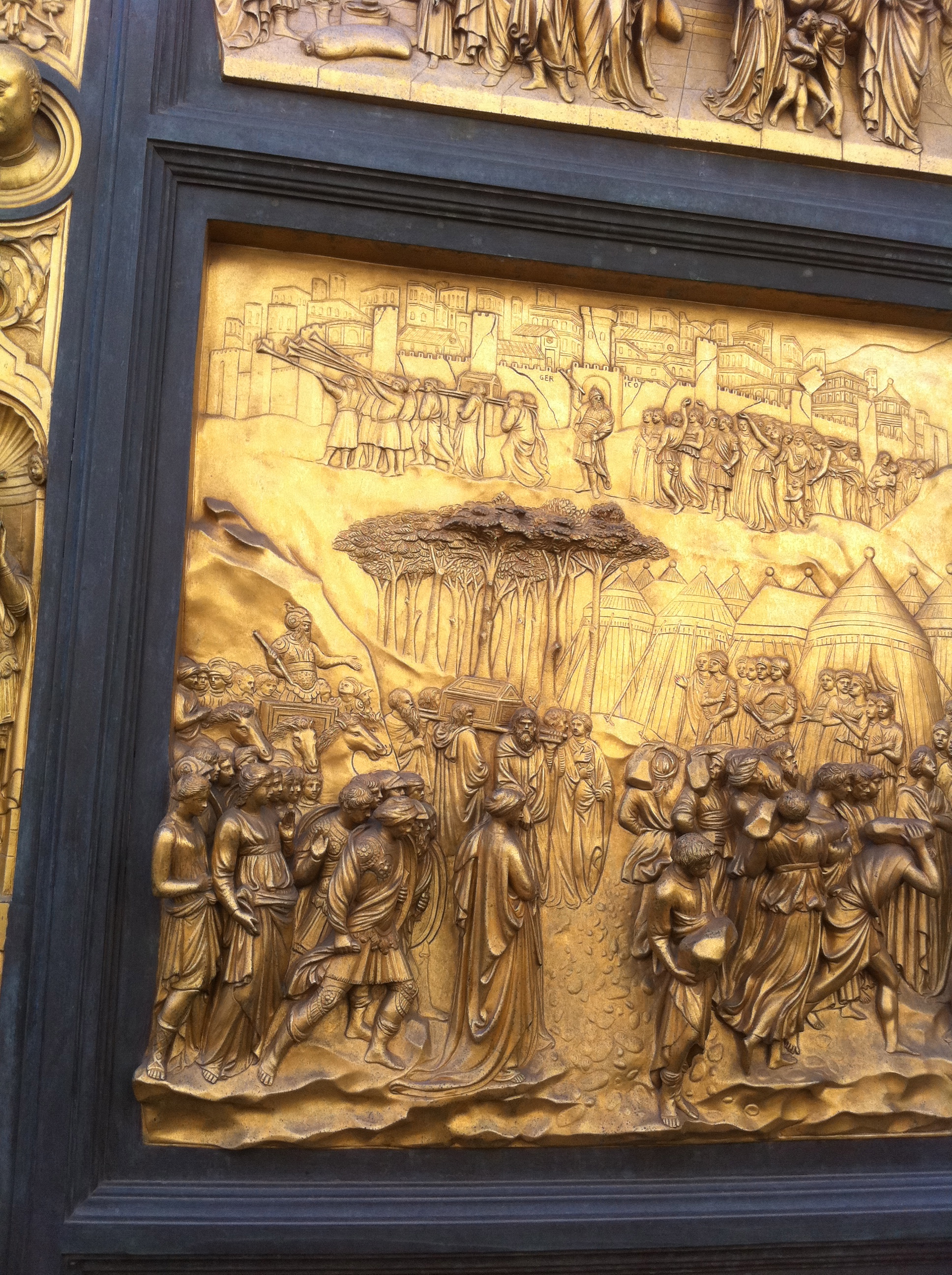 I particularly focused on the gilt bronze panels on the doors that are situated on three sides of the duomo. Additional, similar doors are on the baptistery, the third buildings in the cathedral complex. Like every other aspect of the cathedral, the craftsmanship and detail are of the highest quality. They evidence that the finest artists and intellectuals gravitated to Florence and helped usher in the Italian Renaissance. Look at the detail of the faces and the elegance of the horns.